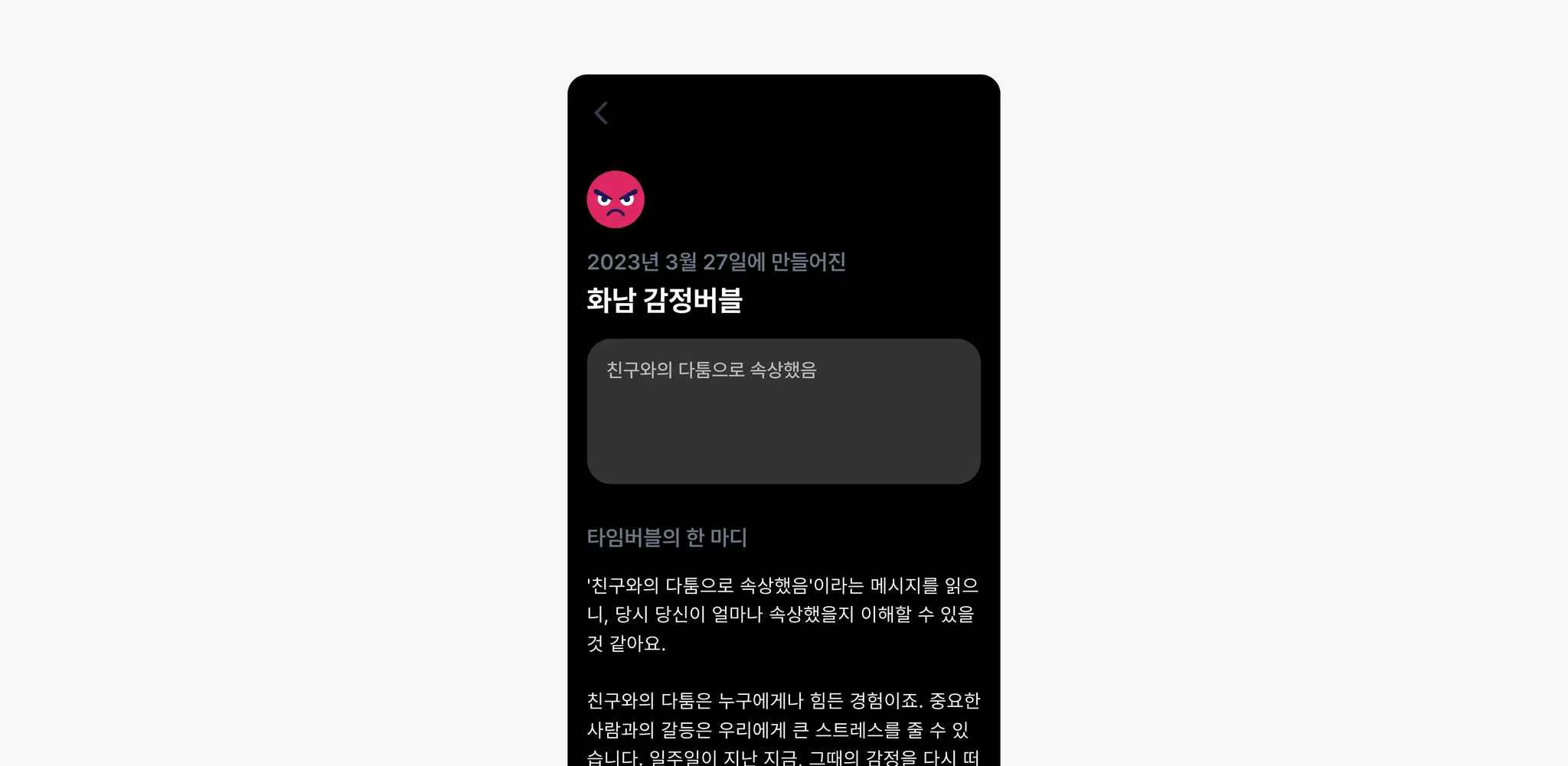 시간이 지난 후 되돌아보기: 감정을 기록한 후, 설정한 시간이 지나면 해당 감정과 메시지를 다시 확인합니다. 이를 통해 그때의 감정을 다시 한번 되새기고, 현재의 자신과 비교해보는 시간을 가질 수 있습니다.